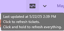 | Partial | Click the data synchronization icon. | ONLY tickets are updated this way. If there are changes to anything else, eg. Jobs, Job Items, Accounts, etc., the changes will not be reflected. | Fast | You’ve made an adjustment to a ticket and want to quickly check it. | |