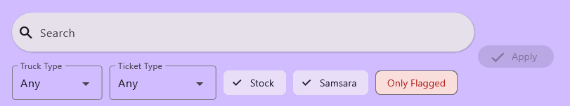 Searching for “RC”, will match all recycled materials. Searching for “AGGXP”, will match all Aggregate Express trucks.