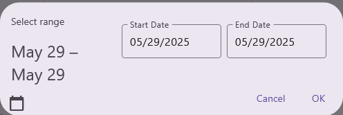 When clicking the button, a calendar will open that allows the user to select a date range.