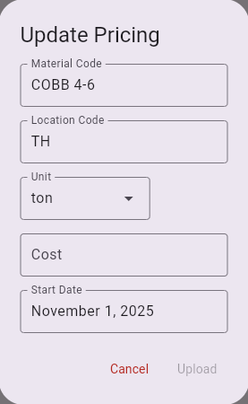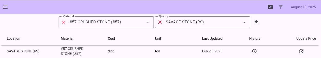 This shows the current pricing for material at different location. It can be filtered by material or by quarry.