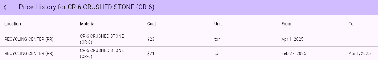 Accessed by clicking the history button, this will show older pricing for the same material a the the location.